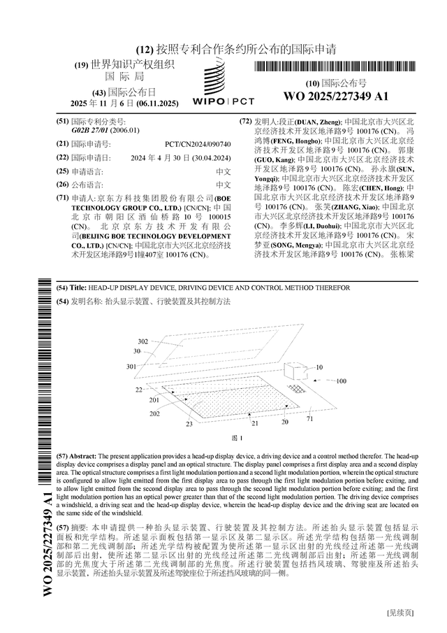 京東方A公布國際專利申請:“抬頭顯示裝置、行駛裝置及其控制方法”