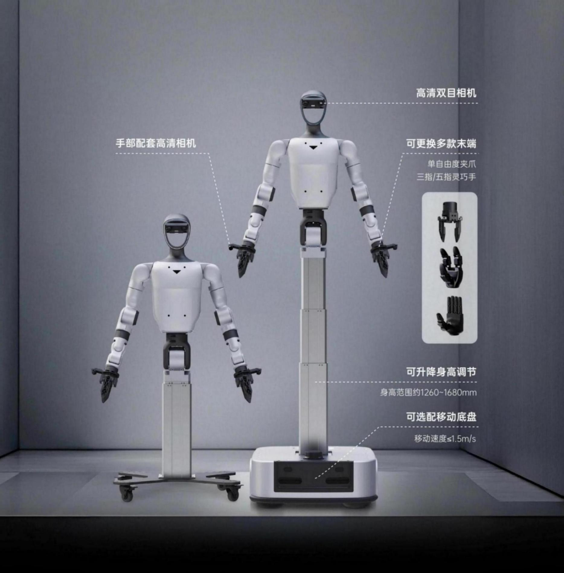 G1-D 機器人身高約 1260-1680mm(立柱高度可調整),其最大特點是頭部和手部均配備了高清相機,實現(xiàn)了獨特的“手眼”協(xié)同觀測。該機器人分為通用版和旗艦版,整機自由度分別為 17 和 19 個,單臂最大負載約 3kg。它采用輪式與升降相結合的移動升降設計,垂直作業(yè)范圍可達 2 米,腰關節(jié)運動空間為 Z±155°、Y -2.5°~+135°。